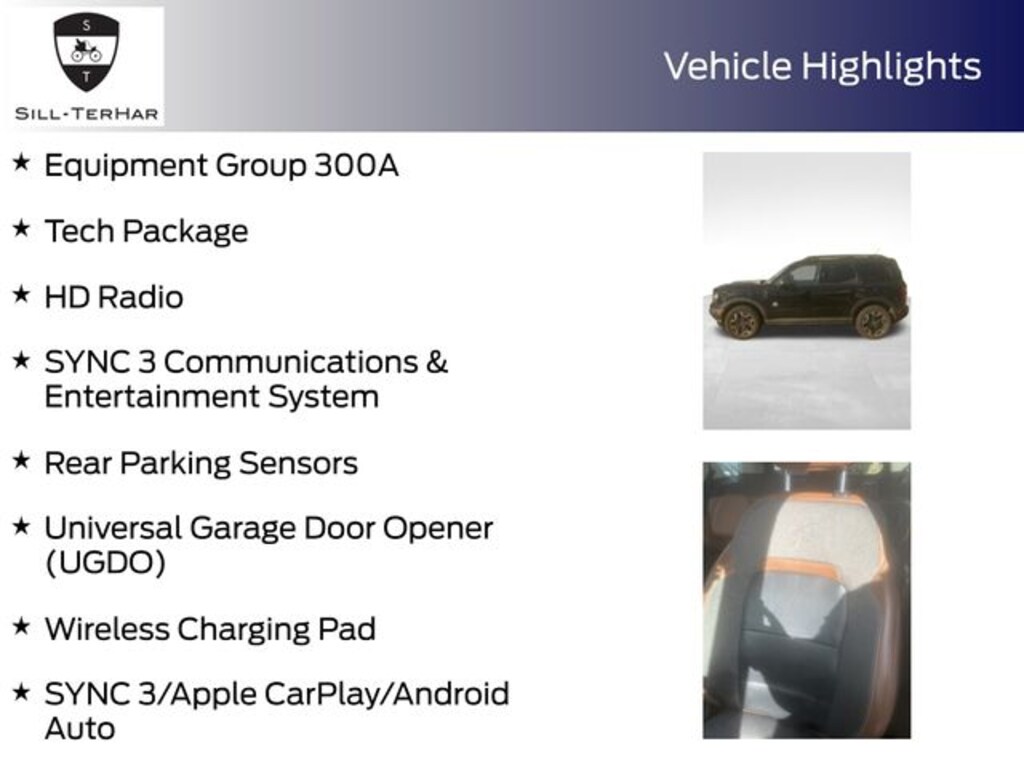 This 2022 Ford Bronco Sport is rare!, Equipment Group 300A, HD Radio, Heated front seats, Rear Parking Sensors, SYNC 3 Communications & Entertainment System, SYNC 3/Apple CarPlay/Android Auto, Tech Package, Universal Garage Door Opener (UGDO), Wheels: 18" Ebony Black-Painted Aluminum, Wireless Charging Pad.