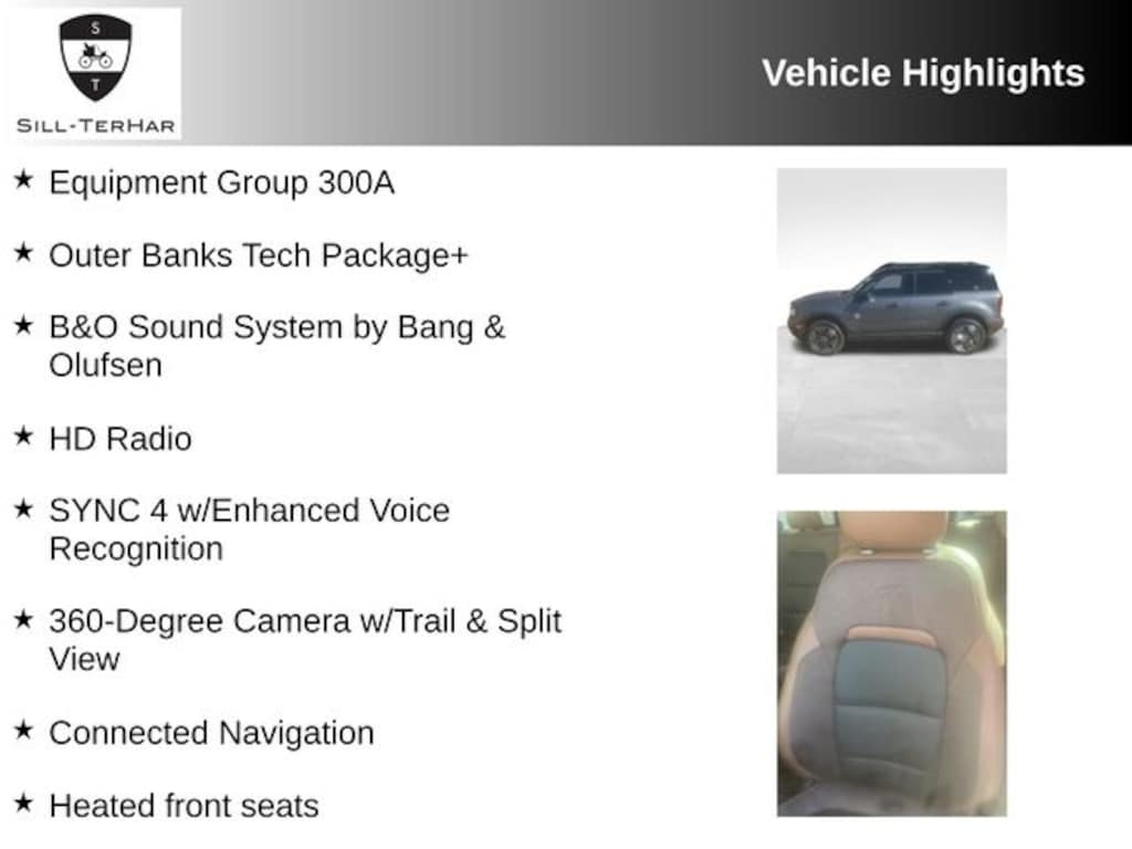 This Bronco Sport Outer Banks is Certified Pre-Owned, giving you the peace of mind that comes with a rigorous multi-point inspection and comprehensive warranty coverage. You can trust that this vehicle has been thoroughly evaluated and is ready to provide you with years of reliable and enjoyable driving.
