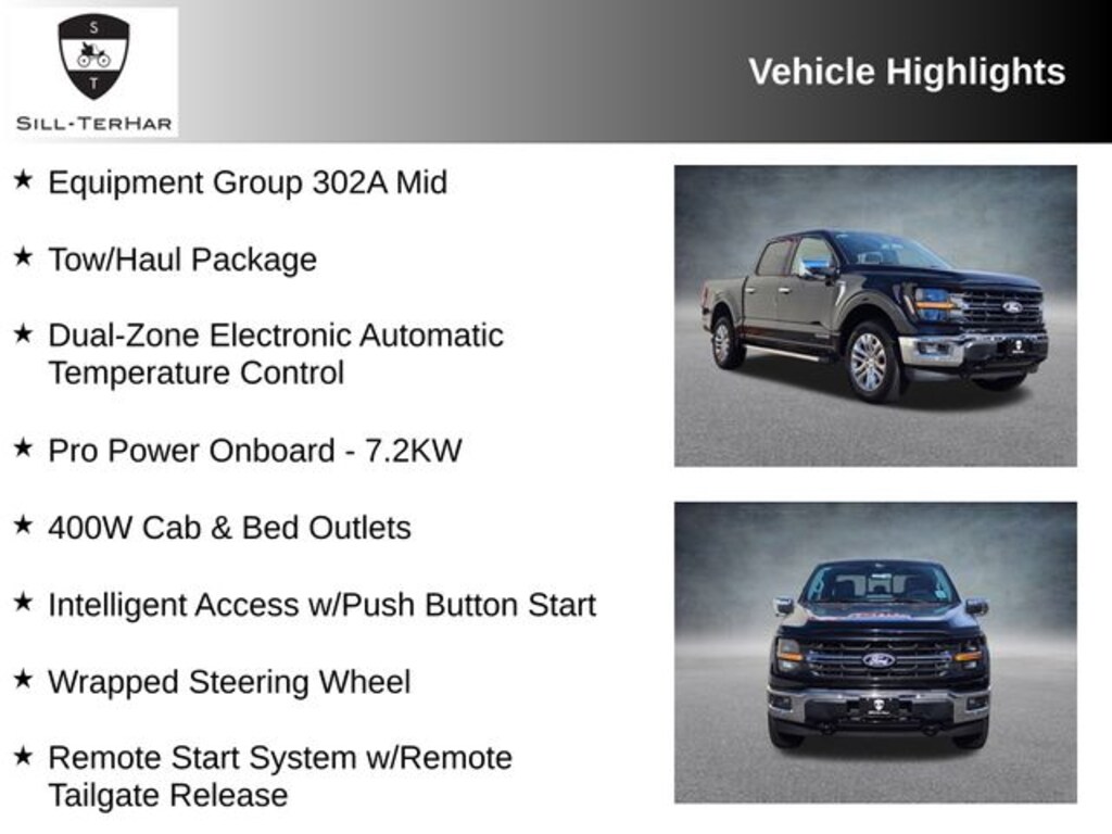 Agate Black Metallic 2025 Ford F-150 XLT 4WD 10-Speed Automatic 3.5L PowerBoost Full-Hybrid V6 This 2025 Ford F-150 is rare!, 360 Degree Camera, 400W Cab & Bed Outlets, 6" Angular Bright Anodized Step Bar, Adaptive Cruise Control w/Stop & Go, Auto-Dimming Rear-View Mirror, Black Painted Grille w/Chrome Center Bar, Chrome Door & Tailgate Handles, Chrome Single-Tip Exhaust, Cloth 40/Console/40 Front Seats, Connected Navigation, Driver State Detection, Dual-Zone Electronic Automatic Temperature Control, Equipment Group 302A Mid, Evasive Steering Assist, Ford Co-Pilot360 Assist 2.0, Front Parking Sensors, Heated Front Seats, Integrated Trailer Brake Controller, Intelligent Access w/Push Button Start, Power Glass Heated Sideview Mirrors, Power-Sliding Rear Window, Pro Power Onboard - 7.2KW, Remote Start System w/Remote Tailgate Release, Tow/Haul Package, Towing Technology, Wrapped Steering Wheel. Price includes: $2000 - Retail Bonus Cash. Exp. 01/05/2026