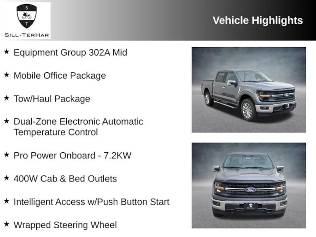 Carbonized Gray Metallic 2025 Ford F-150 XLT 4WD 10-Speed Automatic 3.5L PowerBoost Full-Hybrid V6 This 2025 Ford F-150 is rare!, 360 Degree Camera, 400W Cab & Bed Outlets, 6" Angular Bright Anodized Step Bar, Adaptive Cruise Control w/Stop & Go, Auto-Dimming Rear-View Mirror, Black Painted Grille w/Chrome Center Bar, Chrome Door & Tailgate Handles, Chrome Single-Tip Exhaust, Cloth 40/Console/40 Front Seats, Connected Navigation, Console Worksurface, Driver State Detection, Dual-Zone Electronic Automatic Temperature Control, Equipment Group 302A Mid, Evasive Steering Assist, Ford Co-Pilot360 Assist 2.0, Front Parking Sensors, Heated Front Seats, Integrated Trailer Brake Controller, Intelligent Access w/Push Button Start, Mobile Office Package, Partitioned Lockable Rear Storage, Power Glass Heated Sideview Mirrors, Power-Sliding Rear Window, Pro Power Onboard - 7.2KW, Remote Start System w/Remote Tailgate Release, Tow/Haul Package, Towing Technology, Wrapped Steering Wheel. Price includes: $2000 - Retail Bonus Cash. Exp. 01/05/2026