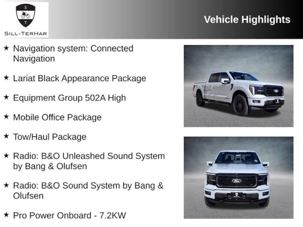 Space White Metallic 2025 Ford F-150 Lariat 4WD 10-Speed Automatic 3.5L PowerBoost Full-Hybrid V6 This 2025 Ford F-150 is rare!, 2nd Row Heated Seats, ActiveX Trimmed Bucket Seats (B), Ambient Lighting - Ice Blue Color Only, Black Exterior Badging, Black Grille, Black Taillamp Bezels, Body-Color Front & Rear Bumpers, Body-Color Skull Caps & Door Handles, Console Worksurface, Dark Interior Appliques, Equipment Group 502A High, Gray Box Side Decal, Heads-Up Display, Illuminated Driver & Passenger Visors, Integrated Trailer Brake Controller, Lariat Black Appearance Package, Matte Black Tailgate F-150 Decal, Mobile Office Package, Navigation system: Connected Navigation, Partitioned Lockable Rear Storage, Power-Sliding Rear Window, Pro Power Onboard - 7.2KW, Radio: B&O Sound System by Bang & Olufsen, Radio: B&O Unleashed Sound System by Bang & Olufsen, SYNC 4 w/Enhanced Voice Recognition, Tow/Haul Package, Twin Panel Moonroof, Ventilated front seats, Wheels: 20" Gloss Black Painted Aluminum, Wireless Charging.