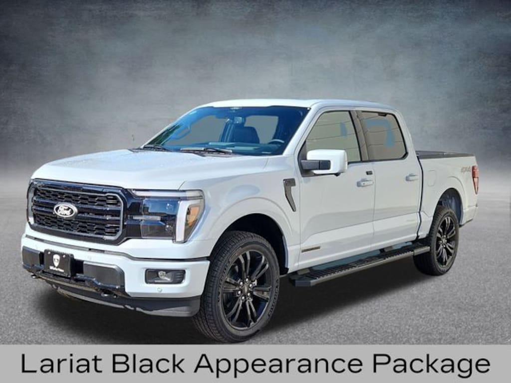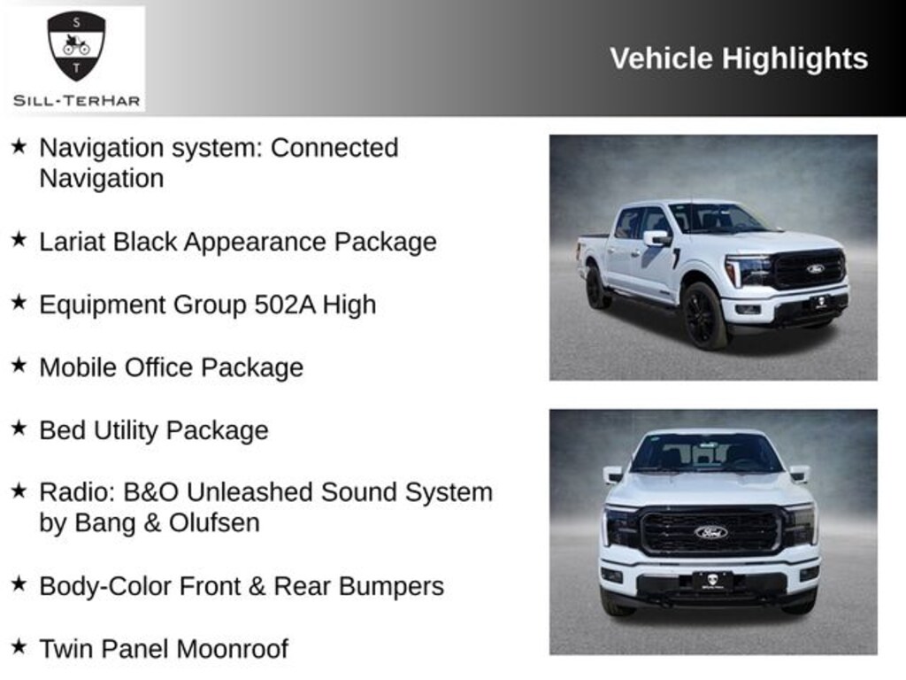 Space White Metallic 2025 Ford F-150 Lariat 4WD 10-Speed Automatic 3.5L PowerBoost Full-Hybrid V6 This 2025 Ford F-150 is rare!, 2nd Row Heated Seats, 4 Pickup Box Tie-Down Plates, ActiveX Trimmed Bucket Seats (B), Ambient Lighting - Ice Blue Color Only, Bed Utility Package, Black Exterior Badging, Black Grille, Black Taillamp Bezels, Body-Color Front & Rear Bumpers, Body-Color Skull Caps & Door Handles, Console Worksurface, Dark Interior Appliques, Equipment Group 502A High, Gray Box Side Decal, Heads-Up Display, Illuminated Driver & Passenger Visors, Lariat Black Appearance Package, LED Box Lighting, Matte Black Tailgate F-150 Decal, Mobile Office Package, Navigation system: Connected Navigation, Partitioned Lockable Rear Storage, Power Tailgate, Power-Sliding Rear Window, Pro Access Tailgate, Radio: B&O Unleashed Sound System by Bang & Olufsen, Twin Panel Moonroof, Wheels: 22" Gloss Black w/o Inserts, Wireless Charging.