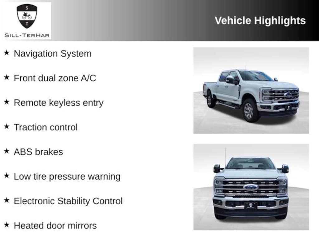 Oxford White 2025 Ford F-350SD Lariat 4WD 10-Speed Automatic Power Stroke 6.7L V8 DI 32V OHV Turbodiesel ABS brakes, Alloy wheels, Compass, Electronic Stability Control, Front dual zone A/C, Heated door mirrors, Heated front seats, Heated rear seats, Illuminated entry, Low tire pressure warning, Navigation System, Remote keyless entry, Traction control.