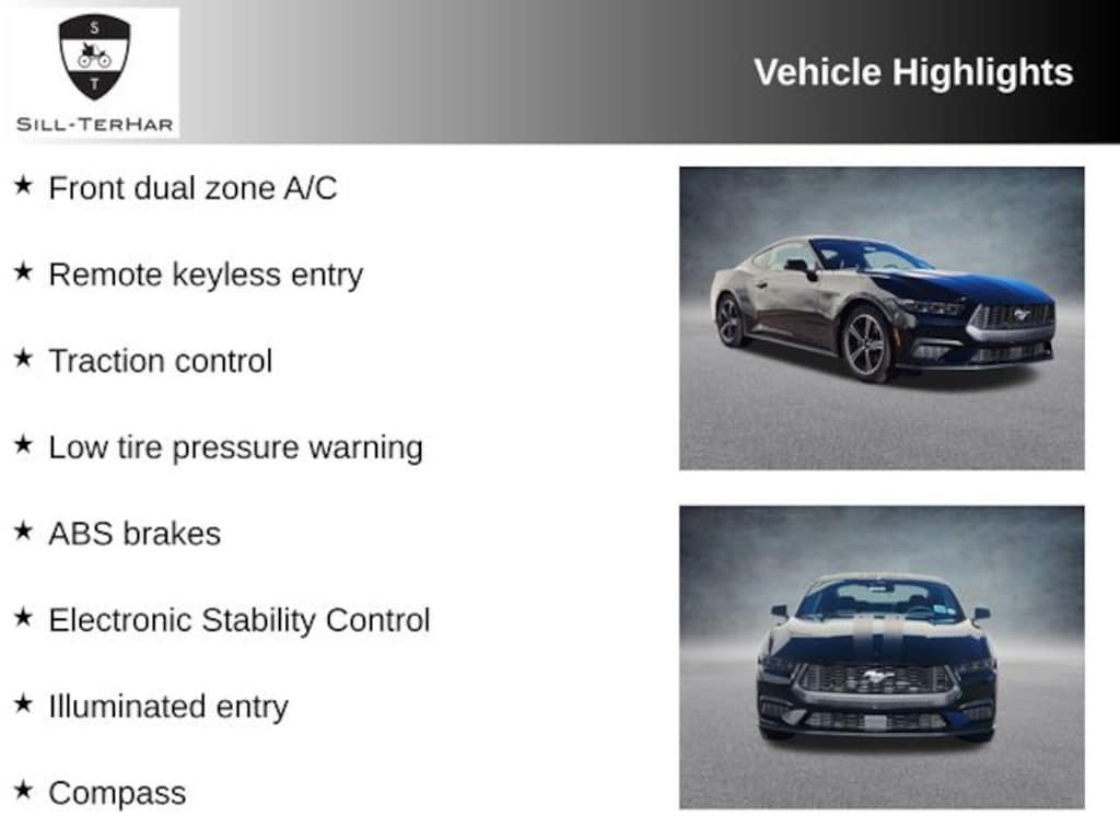 Shadow Black 2025 Ford Mustang EcoBoost RWD 10-Speed Automatic EcoBoost 2.3L I4 GTDi DOHC Turbocharged VCT ABS brakes, Alloy wheels, Compass, Electronic Stability Control, Front dual zone A/C, Illuminated entry, Low tire pressure warning, Remote keyless entry, Traction control.