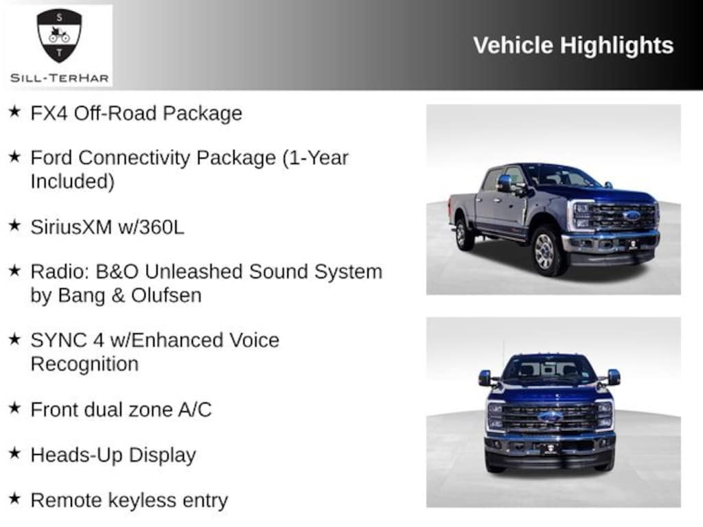 Argon Blue Metallic 2026 Ford F-250SD King Ranch 4WD 10-Speed Automatic 6.7L High Output Power Stroke V8 Diesel ABS brakes, Alloy wheels, Compass, Electronic Stability Control, Ford Connectivity Package (1-Year Included), Front dual zone A/C, FX4 Off-Road Package, Heads-Up Display, Heated door mirrors, Heated front seats, Heated rear seats, Hill Descent Control, Illuminated entry, Low tire pressure warning, Off-Road Specifically Tuned Shock Absorbers, Power-Deployable Running Boards, Radio: B&O Unleashed Sound System by Bang & Olufsen, Remote keyless entry, Traction control, Twin Panel Power Moonroof, Unique FX4 Off-Road Box Decal.