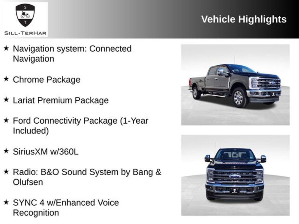 Agate Black Metallic 2026 Ford F-350SD Lariat 4WD 10-Speed Automatic Power Stroke 6.7L V8 DI 32V OHV Turbodiesel 6" Angular Bright Anodized Step Bars, ABS brakes, Alloy wheels, Chrome Door Handles, Chrome Exhaust Tip, Chrome Package, Compass, Electronic Stability Control, Ford Connectivity Package (1-Year Included), Front dual zone A/C, Heated door mirrors, Heated front seats, Heated rear seats, Illuminated entry, Lariat Premium Package, Low tire pressure warning, Navigation system: Connected Navigation, Privacy Glass, Pro Trailer Backup Assist, Pro Trailer Hitch Assist, Remote keyless entry, Traction control, Twin Panel Power Moonroof, Unique Chrome Mirror Caps, Wheels: 20" Chrome PVD Aluminum.