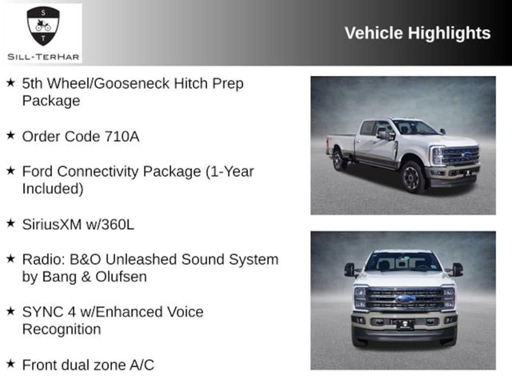 Star White Metallic Tri-Coat 2026 Ford F-350SD King Ranch 4WD 10-Speed Automatic Power Stroke 6.7L V8 DI 32V OHV Turbodiesel 5th Wheel/Gooseneck Hitch Prep Package, ABS brakes, Alloy wheels, Compass, Electronic Stability Control, Ford Connectivity Package (1-Year Included), Front dual zone A/C, Heated door mirrors, Heated front seats, Heated rear seats, Illuminated entry, Low tire pressure warning, Order Code 710A, Radio: B&O Unleashed Sound System by Bang & Olufsen, Remote keyless entry, SiriusXM w/360L, SYNC 4 w/Enhanced Voice Recognition, Traction control, Twin Panel Power Moonroof.
