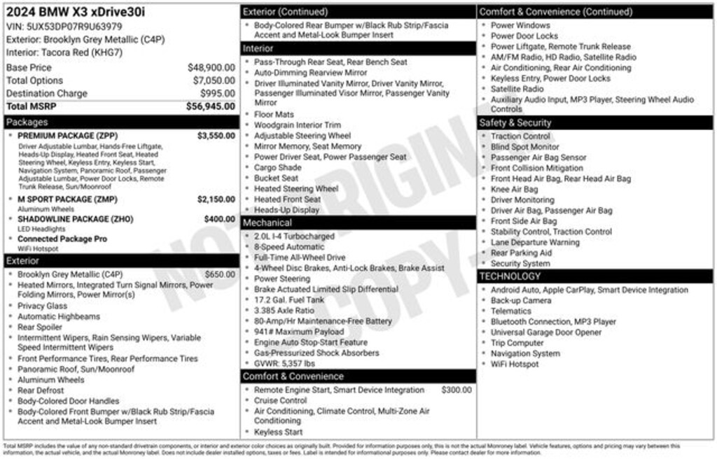 This 2024 BMW X3 is rare!, Aerodynamic Kit, Apple CarPlay & Android Auto Compatibility, Connected Package Pro, Extended Shadowline Trim, Head-Up Display, Heated Front Seats, Heated Steering Wheel, Live Cockpit Pro w/Navigation, Lumbar Support, M Shadowline Lights, M Sport Package, M Sport Package (337), M Steering Wheel, Navigation System, Panoramic Moonroof, Power Liftgate, Premium Package, Roof Rails in High-Gloss Shadowline, Shadowline Exterior Trim, Shadowline Package, Smoke Grey Aluminum Rhombicle Trim, Wheels: 19" x 7.5" Y-Spoke (Style 693), Without Exterior Lines Designation.