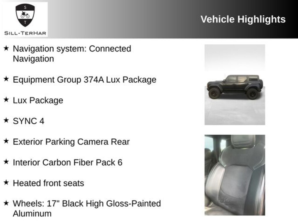 This 2023 Ford Bronco is rare!, Equipment Group 374A Lux Package, Exterior Parking Camera Rear, Heated front seats, Interior Carbon Fiber Pack 6, Lux Package, Navigation system: Connected Navigation, SYNC 4, Wheels: 17" Black High Gloss-Painted Aluminum.