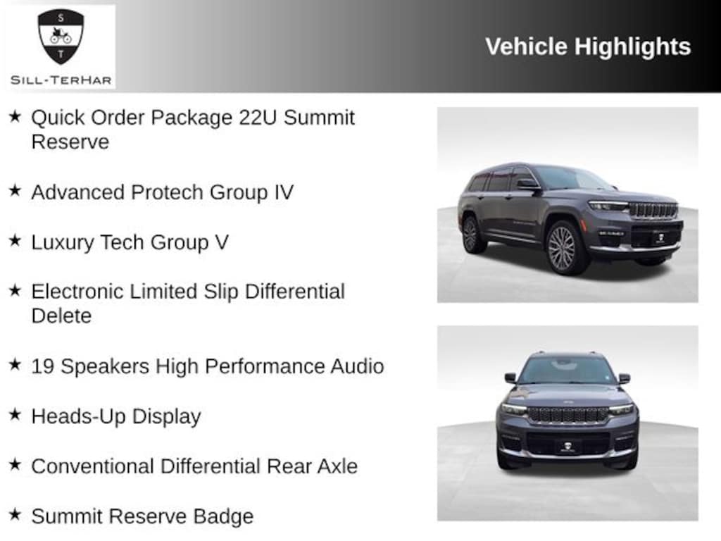 This 2022 Jeep Grand Cherokee L is rare!, 19 Speakers High Performance Audio, 2nd Row Manual Window Shades, Advanced Protech Group IV, Conventional Differential Rear Axle, Deluxe Headliner, Electronic Limited Slip Differential Delete, Front Passenger Interactive Display, Heads-Up Display, Interior Rear Facing Camera, Luxury Tech Group V, Night Vision/Pedestrian-Animal Detection, Palermo Leather Door Trim, Palermo Leather Seats, Quick Order Package 22U Summit Reserve, Rearview Autodim Digital Display Mirror, Summit Reserve, Summit Reserve Badge, Ventilated Rear Seats, Wheels: 21" x 9.0" Machined Face/Painted Aluminum, Wireless Charging Pad.