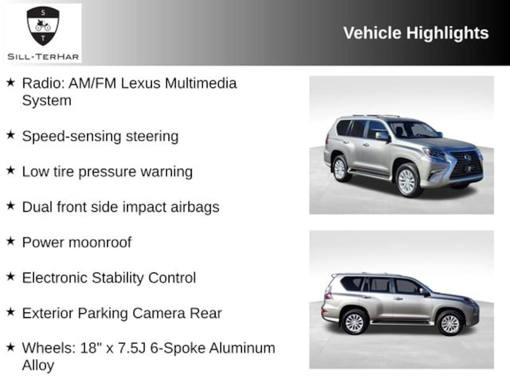This 2020 Lexus GX is rare!, Dual front side impact airbags, Electronic Stability Control, Exterior Parking Camera Rear, Low tire pressure warning, Power moonroof, Radio: AM/FM Lexus Multimedia System, Speed-sensing steering, Wheels: 18" x 7.5J 6-Spoke Aluminum Alloy.