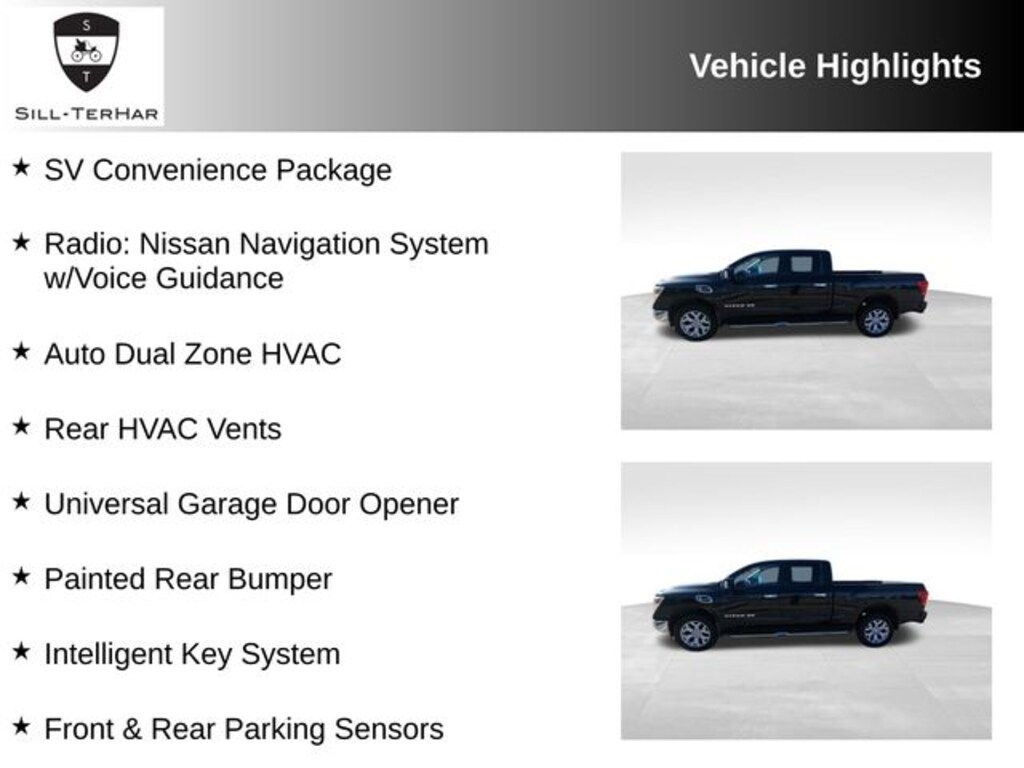 - This Titan XD is equipped with the SV Convenience Package, which includes must-have features like the Nissan Navigation System with voice guidance, auto dual-zone climate control, rear HVAC vents, and a universal garage door opener.